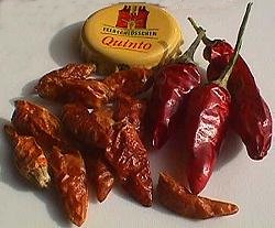 画像左側が市販乾燥チリ、右が生を乾燥させた物。 |