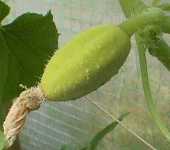 サラダみどりは土這いきゅうりと袋に書いてありますが、私はいつも支柱を立て紐を張ってそこに吊っています。その方がなんとなく形がすらっと細長くなるような気がして...(^.^)リンゴきゅうりの種はオーストラリアから送ってもらいました。種まきは3月上旬に家の中で、サラダみどりだけをし、その後、4月に外に定植し苗と苗の間に種を直植えして時間差で収穫できるようにしてみました。全部で8株はあるでしょうね。リンゴきゅうりは4株をやはり4月に外に直植えしました。