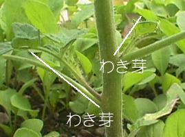 トマトが成長すると共に、各葉っぱ(葉腋)から脇芽が伸び始めます。大切な養分を余計な葉っぱに持っていかれない為にもこの脇芽は小さいうちに指先でブッチッとかき取っておきましょう。まめに様子を見ないと、小さな脇芽があっという間に大きな枝になっちゃうよ。